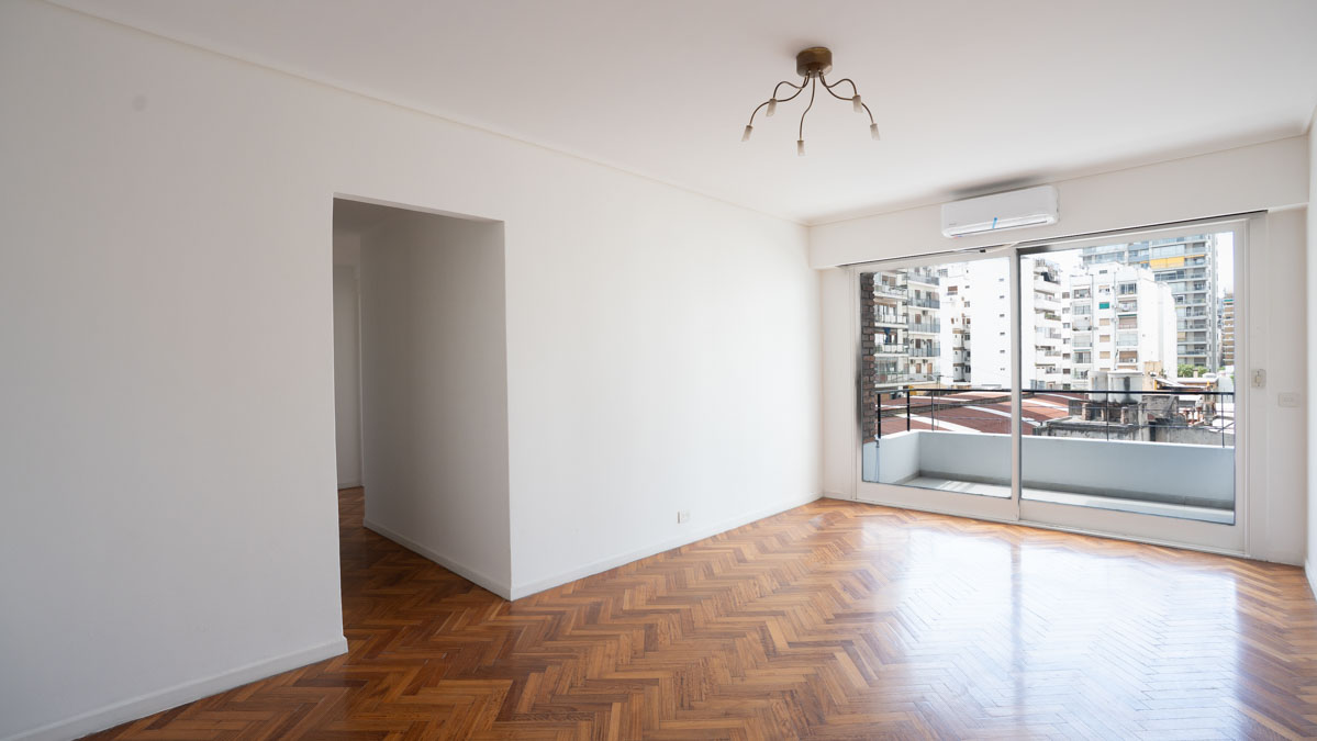– Living con pisos de roble, hogar de mármol y salida a balcón con vista al Hotel Alvear.
